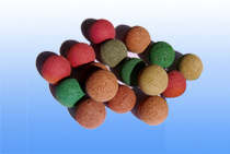 ·金剛砂膠球 金剛砂膠球分為全金剛砂膠球和半金剛砂膠球兩種。金剛砂膠球適用于清除各種結垢沉積較多的管道,但對管子有傷害,一般不長(cháng)期使用,特別銅管更慎用。 有效去除硬質(zhì)結垢,如:碳酸鈣。適用于鋼管、不銹鋼管換熱器。